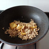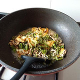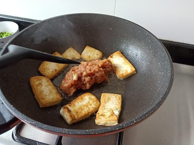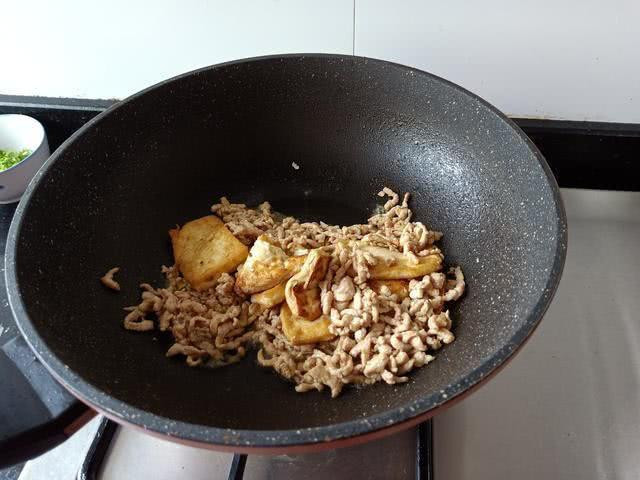 6.把豆腐划至锅的四周,倒入腌制后的肉丝,迅速划散翻炒。(这就是不粘锅的好处,用油少,又不粘锅。)