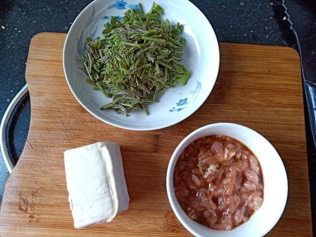 材料:香椿,肉丝,豆腐,盐,酱油,料酒