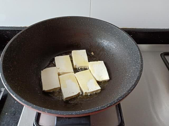 4.锅内加油,烧热,改中火,左手拿豆腐,右手拿铲子或刀,把豆腐一片片切下入锅。