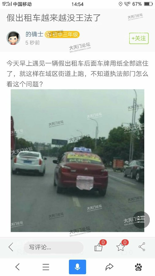 今天早上在学院路遇见一辆假出租车,后面车牌照用纸全部遮住了,就这样在城区街道上跑,不知道执法部门怎么看这个问题?