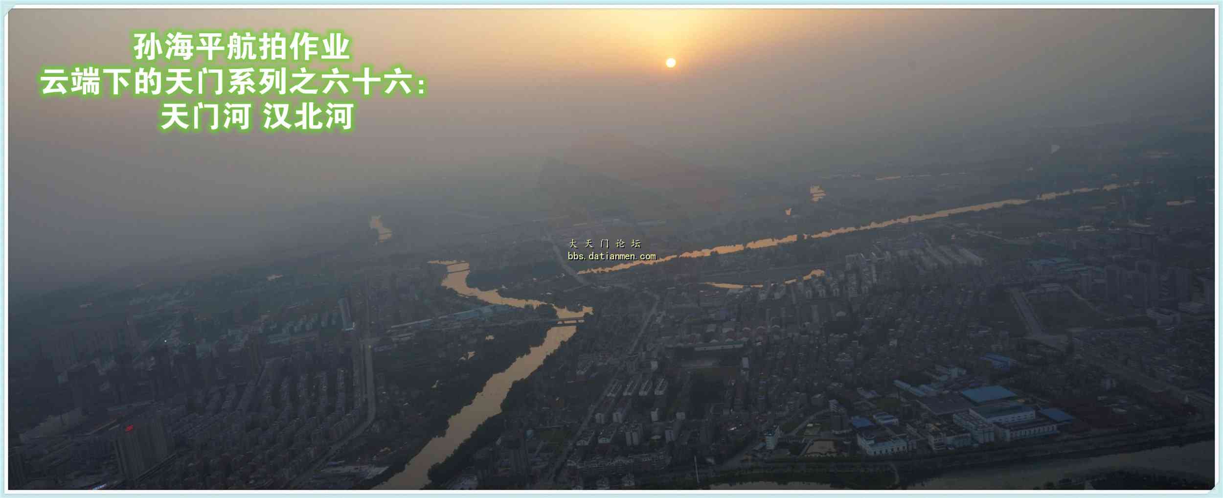 天门人的母亲河----天门河。天门人的命脉河----汉北河。这是老孙对这两条河的定义。天门河在天门的土地上流淌~~流淌了多少年,流走了多少故事......老孙不知道~~只记得陆羽的“千羡万羡西江水 曾向竟陵城下来”这句话,想必当初的陆羽也深爱这条河吧~~~汉北河,我记得天门河污染后,天门人的生活用水一直在这里取水的,这是天门人的命脉河,试想想,如果没有这条河,天门人该怎么样?今天试飞机,用无动力云台上天了~~画面都是歪的~~拍了几百张照片,几乎都是废片~~最后就找了这几张,交作业也~~对了~~亲们,请当作业看~~可以拍砖,您说什么老孙都会笑纳~~谢谢了~~~