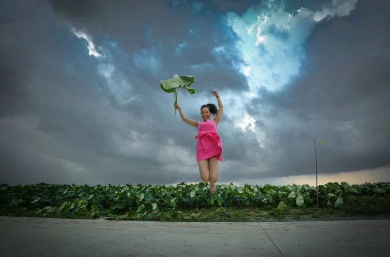 夏天的天气真是瞬息万变,短短几分钟功夫,黑压压的一片乌云铺天盖地的向我们泼洒过来,风更大了,荷叶荷花在风里肆无忌惮的摇曳飞舞,连着天边的碧绿惊成了浅绿色,风吹起了荷叶的底色,她们都向着同一个方向倾斜着,露出了桀骜不驯的骨杆。向我展示她们出污泥而不染的卓越风姿。