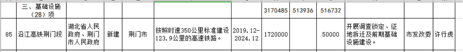 一直关心沿江高铁进展,期望能城区设站。昨日在荆门政府网看到 关于高质量推动荆门市2019—2020年重大项目建设的通知www.jingmen.gov.cn/govinfo/szf_xxgk/201904/t20190412_267901.shtml 4号附件2:荆门市2019年重大项目推进计划(省级重点项目).xls 有沿江高铁的消息。希望有识之士能辨别其含意,引起重视。