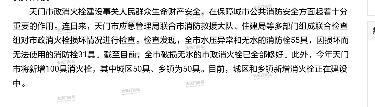 防火是保障人民生命财产的最中之重,今年天门将新增100具消火栓其中城区50具乡镇50具。