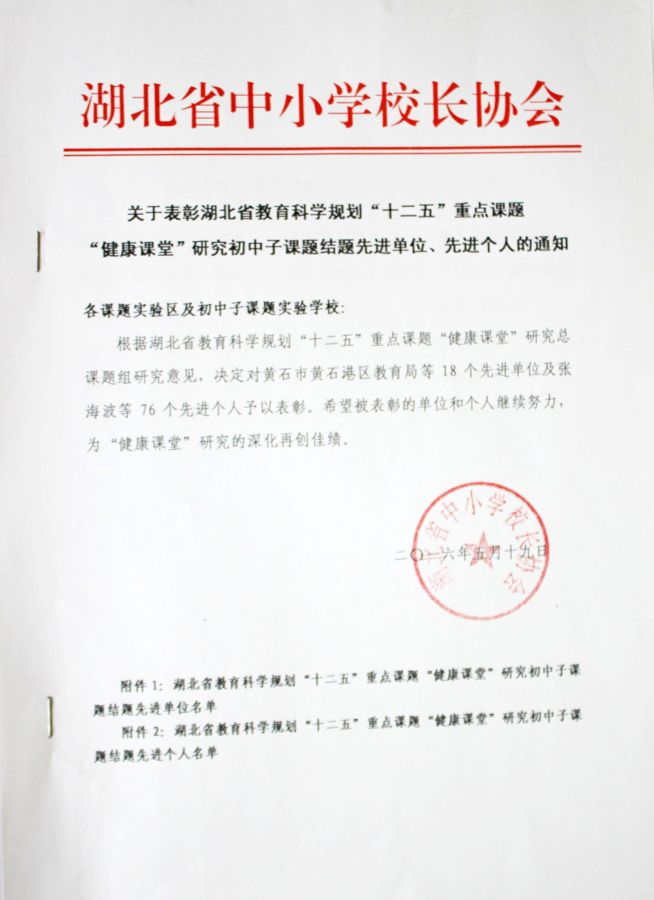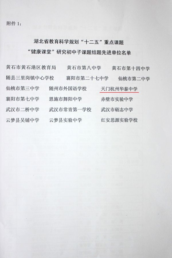 在日前我校召开的湖北省教育科学规划“十二五”重点课题“健康课堂”研究结题会上,华泰中学被评为课题研究先进单位,教科室主任周思军被评为先进个人。