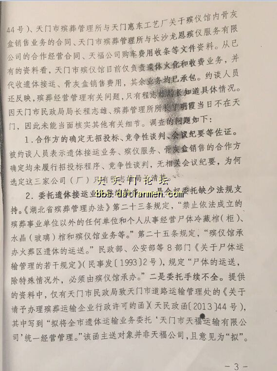 从调查组反映的情况来看,“天门市殡仪馆目前仅负责遗体火化和收费业务并代收遗体接送、骨灰盒销售费用,其余业务均已承包”,“殡仪馆经营管理有关问题,如遗体接送、殡仪服务、骨灰盒销售等合作方的确定只有天门市民政局局长程志雄局长知道”,在省厅调查组调查天门市殡葬管理问题期间,天门市民政局局长程志雄明显抵触和不配合,事后更是阳奉阴违,变本加厉。省厅调查报告作出后,相关合作企业天福公司还进一步成立分公司,以原殡仪车的车主无《道路经营许可证》为由,企图依托行政权力取缔相关车主的承运资格。此外,调查报告涉及到“不允许逝者家属自带骨灰盒、不允许遗体接送司机销售骨灰盒、殡仪馆销售的骨灰盒、纸棺价格远远高于市场价,雇佣社会闲杂人员以恐吓、打砸等违法手段阻止殡仪馆周边个体户出售骨灰盒。”等乱象,即使在省厅已经形成了有效的建议后,其改进措施也难以推行。种种情况让我们怀疑,个别官员在其中有利益,存在腐败问题。故恳请省民政厅采取措施进一步调查处理,以切实解决天门市殡葬管理中存在的问题,进一步完善殡葬市场规范,并维护殡葬从业人员和广大丧户的合法权益。