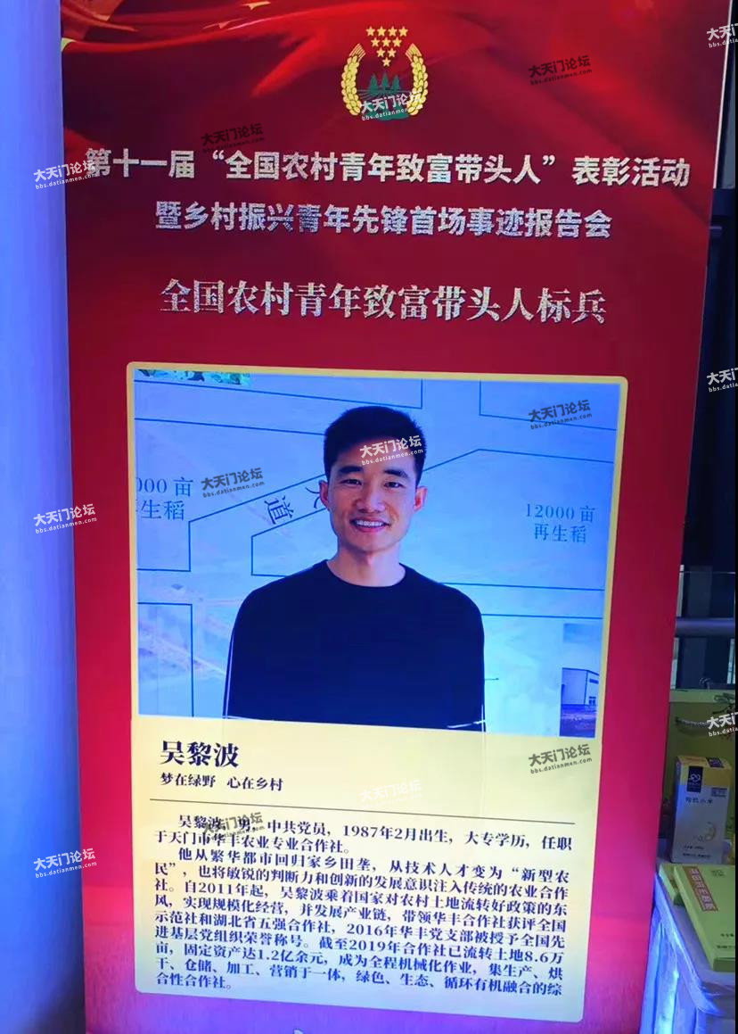 会上,天门青年吴黎波被授予“全国农村青年致富带头人标兵”荣誉称号。