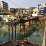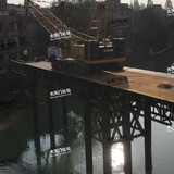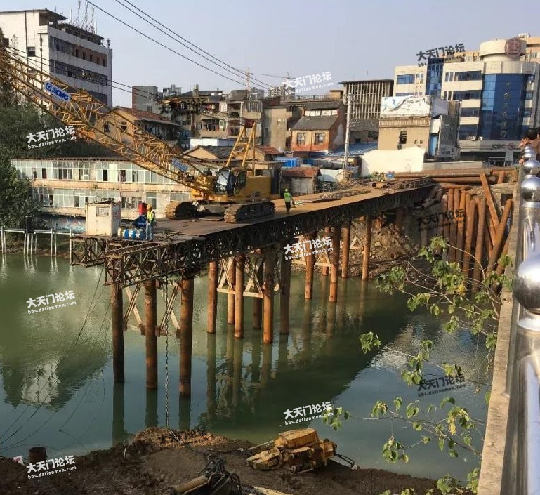 在现场看到,大桥边上的钢栈桥已经建了三分之二,现在还在加速推进争取早日完成。现场负责人告诉小编,钢栈桥的作用不是用于临时通行,是为工程项目服务的,主要是便于后期拆除老桥的吊装及新桥的支架搭设,待新桥建成后钢栈桥会随即拆除。
