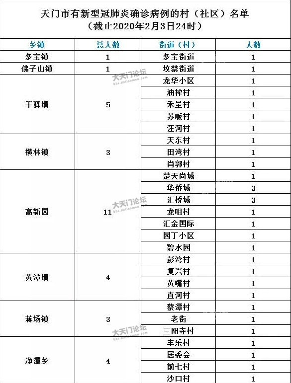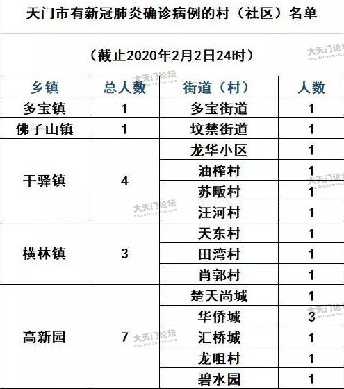 截至2020年2月2日24时,天门市累计报告新型冠状病毒感染的肺炎病例115例,其中重症病例49例,危重病例2例,死亡10例。目前,105名患者均在定点医疗机构接受隔离治疗。