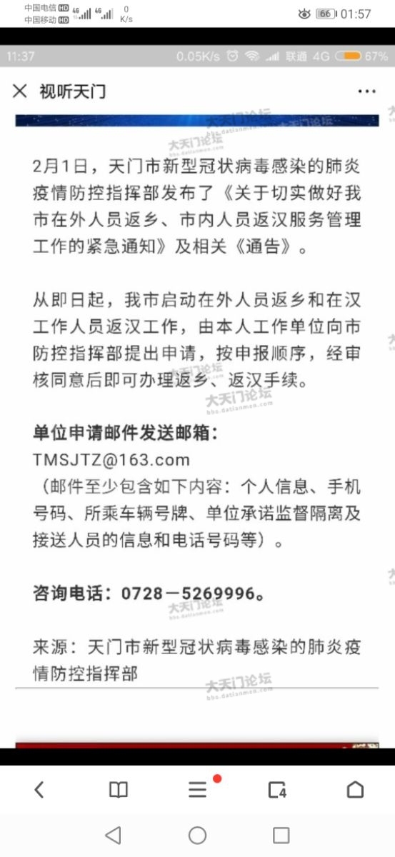 老婆与元月21日,携孩子从广西柳州回湖北天门市皂市镇探亲,可惜此刻湖北省境内封锁,他们母子已无法返程,前几天登录贵坛,发现了这则通告,喜悦之余,联系到老婆的单位,向天门市新冠肺炎防控指挥部发送了邮件申请,可二十四小时都过去了,还没有收到任何回复。期盼相关部门能提高工作效率,加快审核速度,能让我从广西柳州出发,把老婆孩子接回,并承诺她们母子返桂后,积极向柳州市疫情防控部门报告,并自觉在家隔离。