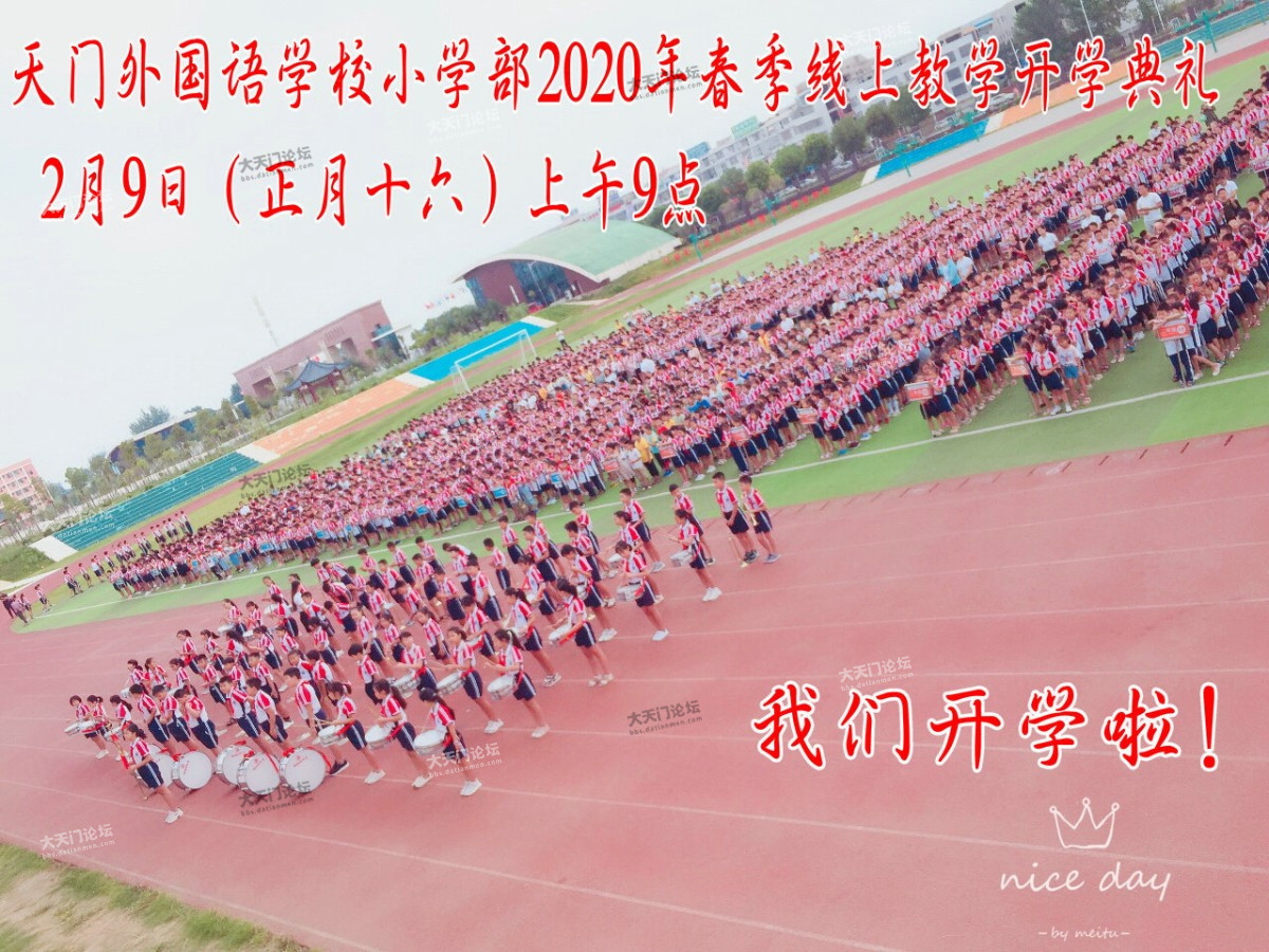 2020年的春节,肺炎疫情突如其来,整个春节笼罩着一层紧张的氛围,当前疫情依然非常严峻复杂。天门市育局发布了延迟开学的通知,所有学校“停课不停学、离校不离教”。2月9日(正月十六)上午9点--10点,天门外国语学校小学部2020年春季线上教学开学典礼在雄壮的国歌音乐中开始,全校近3800名师生参加了今天的开学典礼。