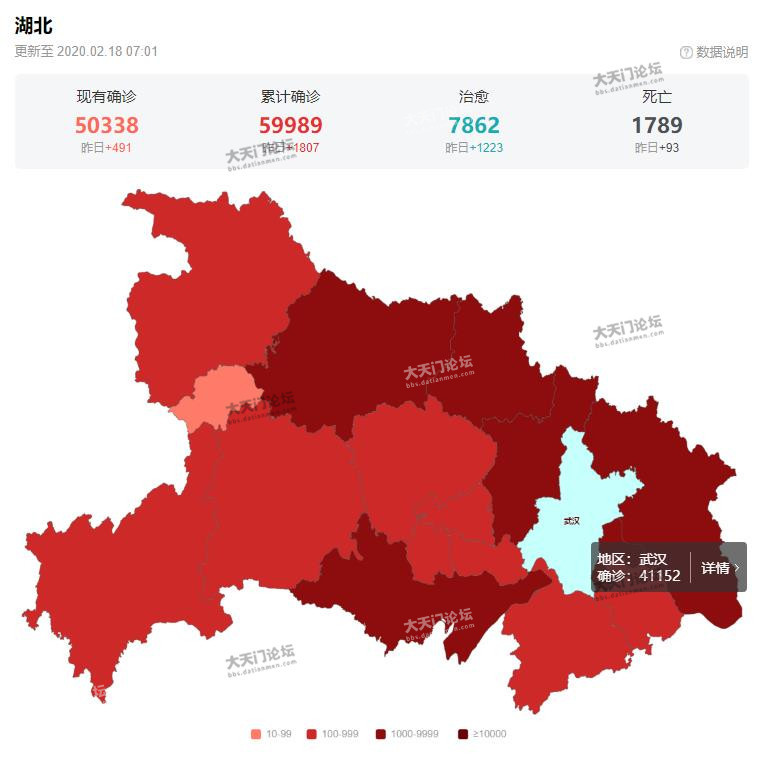 全省累计治愈出院7862例。全省累计病亡1789例,其中:武汉市1381例、黄冈市84例、孝感市75例、荆州市38例、鄂州市36例、荆门市33例、随州市25例、宜昌市24例、襄阳市21例、黄石市20例、仙桃市19例、天门市11例、咸宁市10例、潜江市6例、恩施州4例、十堰市2例。