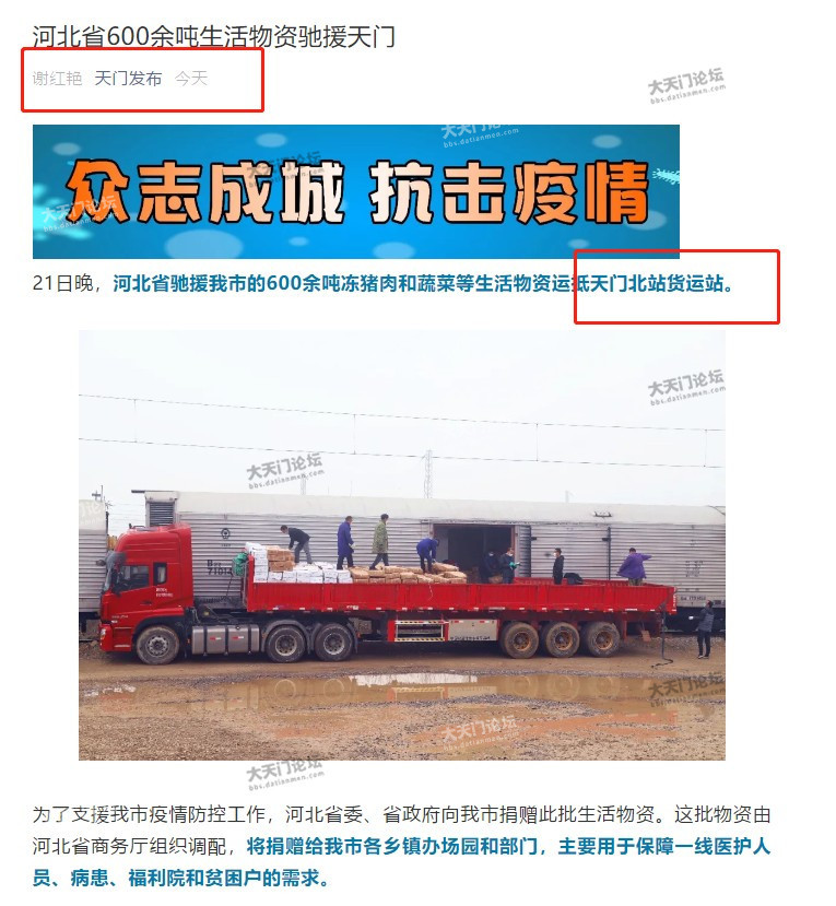 微信公众号“天门发布”,里面说“21日晚,河北省驰援我市的600余吨冻猪肉和蔬菜等生活物资运抵天门北站货运站”