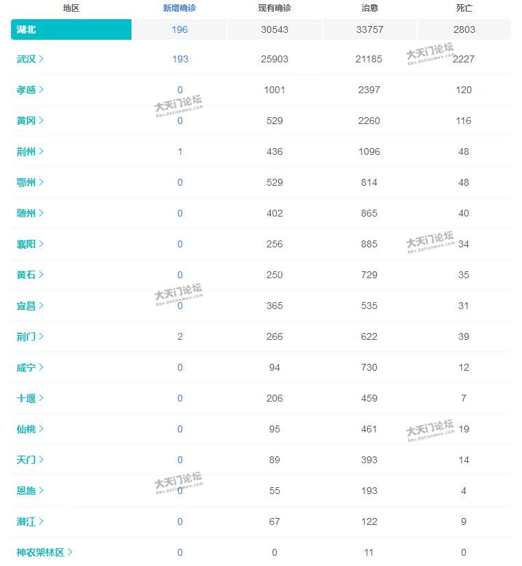 全省新增病亡42例,其中:武汉市32例、荆州市2例、荆门市2例、孝感市2例、黄石市1例、鄂州市1例、黄冈市1例、天门市1例,十堰市、襄阳市、宜昌市、咸宁市、随州市、恩施州、仙桃市、潜江市、神农架林区均为0例。