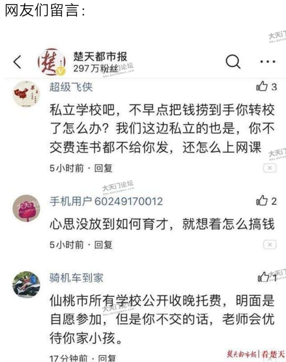 追踪|仙源学校预收费几百万,教育局称“必须退,全额退” 楚天都市报4月17日讯(记者刘冬莉)违反教育部规定,仙桃市仙源学校还未开学,却预收了学生数百万学费。今天该市教育局表态了:对乱收费零容忍,违规提前收取的费用,必须“立即、全额”退还。 16日,楚天都市报记者调查《孩子们还在家里待,仙桃一学校却预收了几百万》发出后,立即引起广泛关注(相关报道见文后链接)。 仙桃市教育局称,已约见该校负责人,明确指令所有预收学费必须退,全额退! 仙源学校校长钟伟称:目前已预收800余学生共计400多万元学费。今日已启动退费程序,学生家长可凭缴费发票分批前来办理全额退费。 家长们担心的“上网课收不收费”?记者追问后,钟伟答复:上网课是免费的,不收了。 对此,楚天都市报将继续予以关注。投诉电话027-86777777 【来源:楚天都市报】