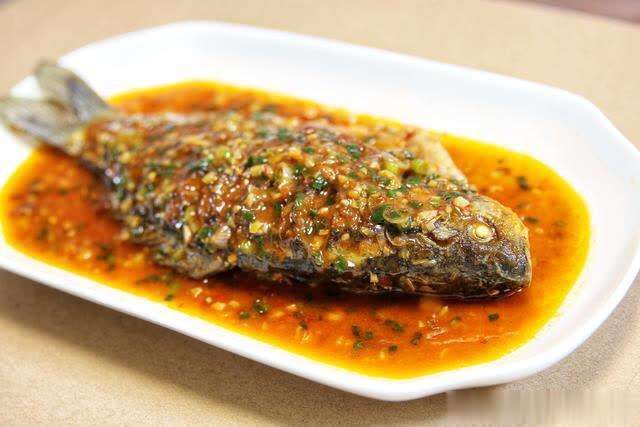 第四步:鱼出锅后,汤汁留锅内,加一茶匙糖提鲜,加一茶匙醋,加点蚝油然后勾芡。烧一会,汤汁浓稠,淋到鱼身上。鱼身上再撒点葱花或者香菜。就大功告成了。