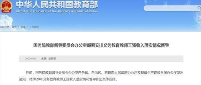 国务院教育督导办在教育部网站发布通知:2020年把义务教育教师平均工资收入水平不低于当地公务员作为督导检查重点。