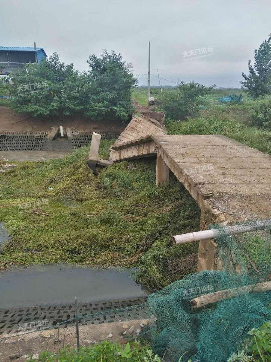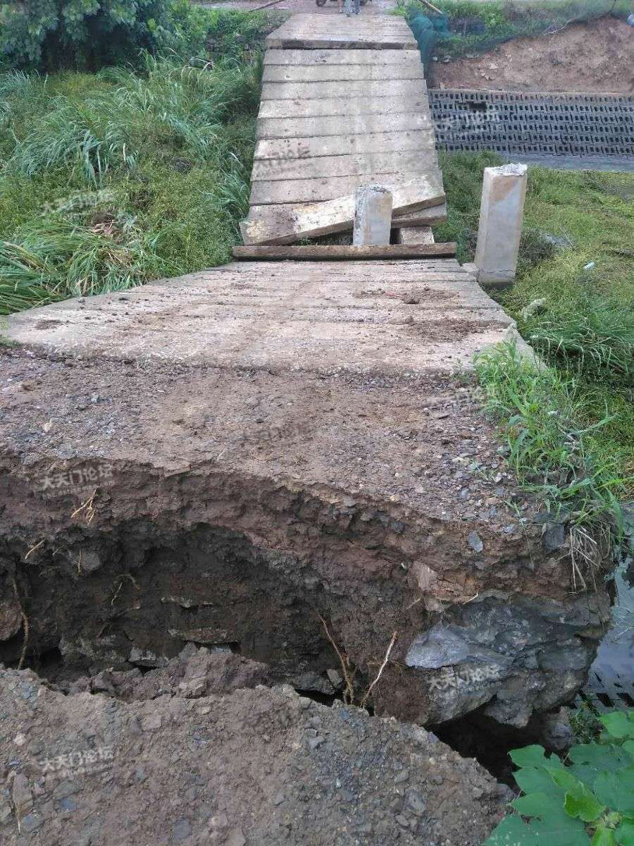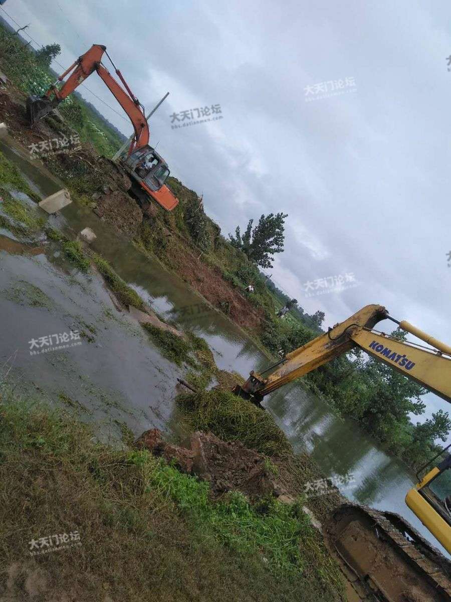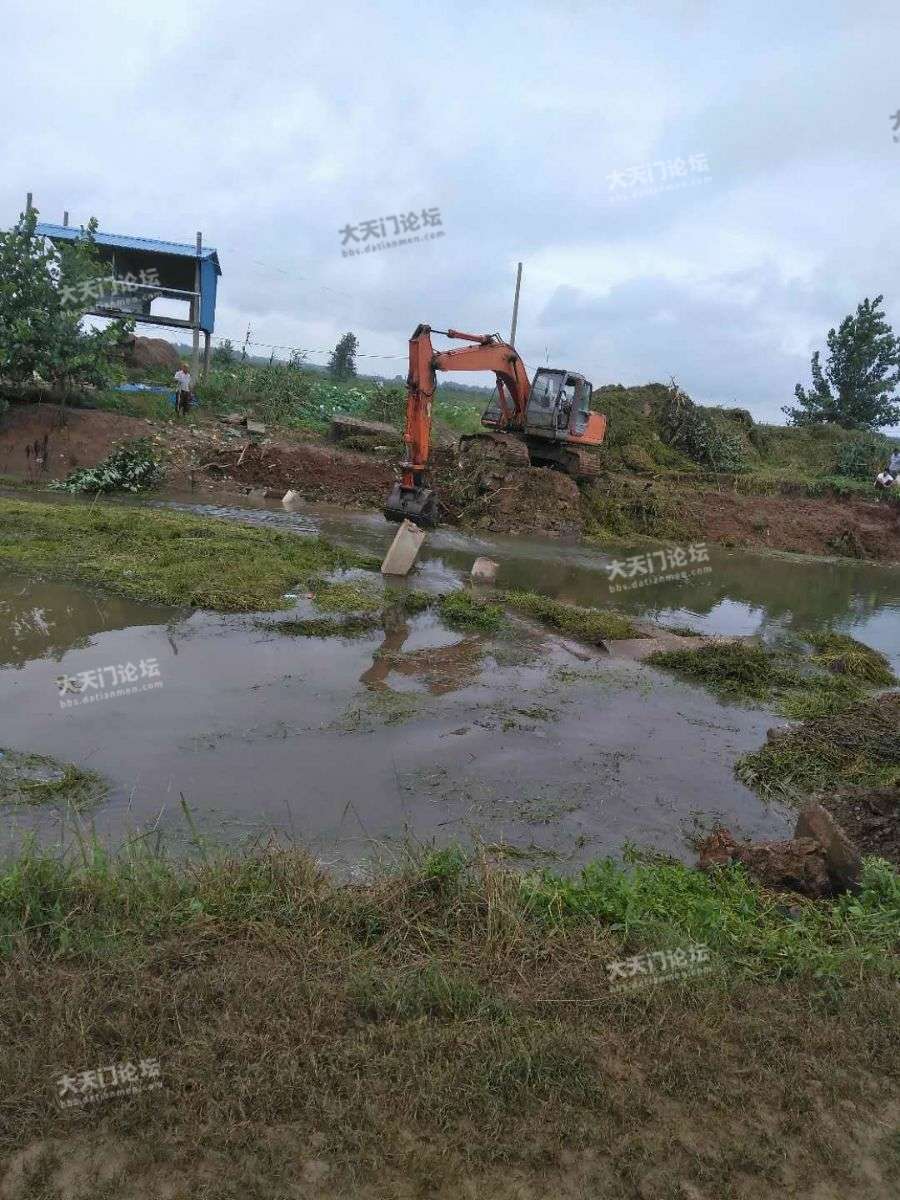 由于水流为患,为防止再次塌陷,村领导联系镇政府,中午来了4 台挖机,疏通塌陷处杂草和桥体的水流,电排抽水,减轻农作物水患