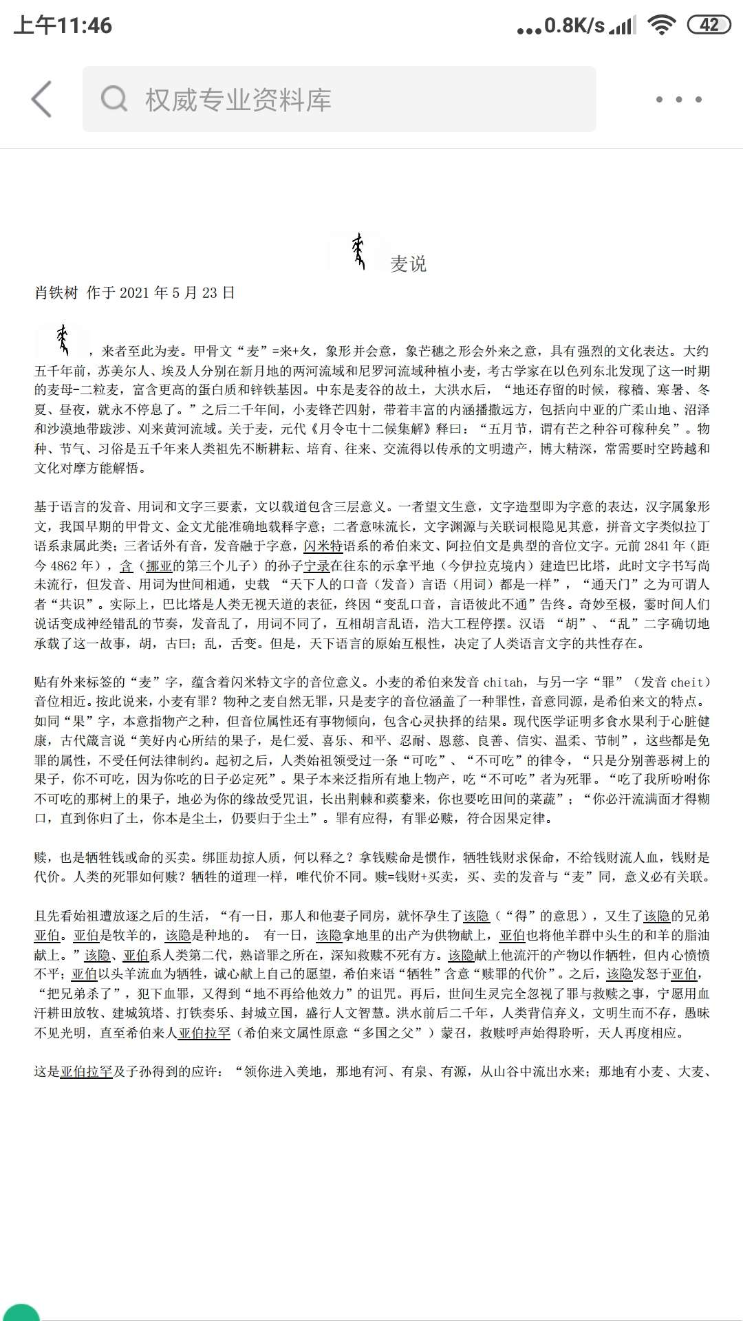 贴有外来标签的“麦”字,蕴含着闪米特文字的音位意义。小麦的希伯来发音chitah,与另一字“罪”(发音cheit)音位相近。按此说来,小麦有罪?物种之麦自然无罪,只是麦字的音位涵盖了一种罪性,音意同源,是希伯来文的特点。如同“果”字,本意指物产之种,但音位属性还有事物倾向,包含心灵抉择的结果。现代医学证明多食水果利于心脏健康,古代箴言说“美好内心所结的果子,是仁爱、喜乐、和平、忍耐、恩慈、良善、信实、温柔、节制”,这些都是免罪的属性,不受任何法律制约。起初之后,人类始祖领受过一条“可吃”、“不可吃”的律令,“只是分别善恶树上的果子,你不可吃,因为你吃的日子必定死”。果子本来泛指所有地上物产,吃“不可吃”者为死罪。“吃了我所吩咐你不可吃的那树上的果子,地必为你的缘故受咒诅,长出荆棘和蒺藜来,你也要吃田间的菜蔬”;“你必汗流满面才得糊口,直到你归了土,你本是尘土,仍要归于尘土”。罪有应得,有罪必赎,符合因果定律。