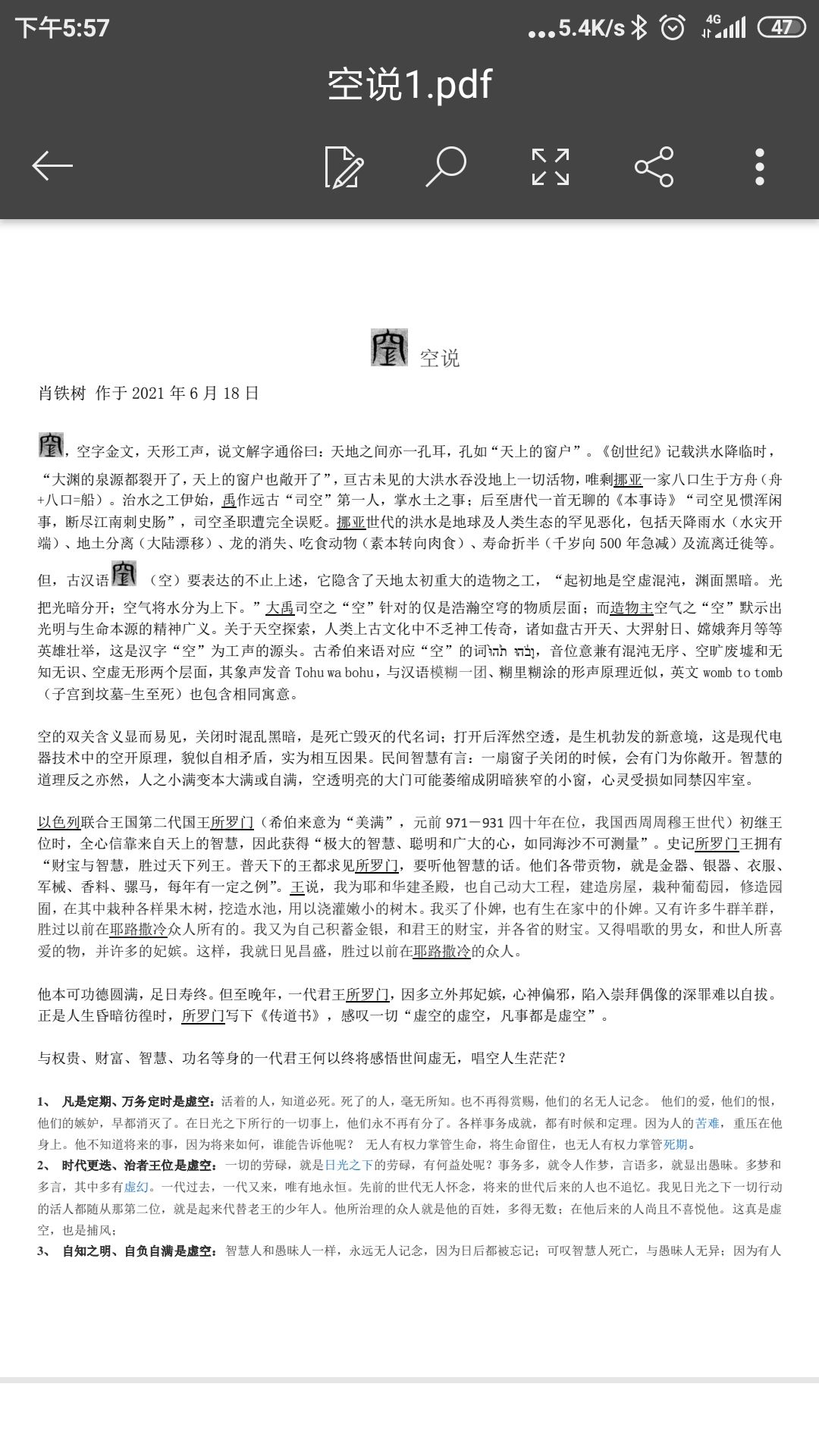 ,空字金文,天形工声,说文解字通俗曰:天地之间亦一孔耳,孔如“天上的窗户”。《创世纪》记载洪水降临时,“大渊的泉源都裂开了,天上的窗户也敞开了”,亘古未见的大洪水吞没地上一切活物,唯剩挪亚一家八口生于方舟(舟+八口=船)。治水之工伊始,禹作远古“司空”第一人,掌水土之事;后至唐代一首无聊的《本事诗》“司空见惯浑闲事,断尽江南刺史肠”,司空圣职遭完全误贬。挪亚世代的洪水是地球及人类生态的罕见恶化,包括天降雨水(水灾开端)、地土分离(大陆漂移)、龙的消失、吃食动物(素本转向肉食)、寿命折半(千岁向500年急减)及流离迁徙等。但,古汉语 (空)要表达的不止上述,它隐含了天地太初重大的造物之工,“起初地是空虚混沌,渊面黑暗。光把光暗分开;空气将水分为上下。”大禹司空之“空”针对的仅是浩瀚空穹的物质层面;而造物主空气之“空”默示出光明与生命本源的精神广义。关于天空探索,人类上古文化中不乏神工传奇,诸如盘古开天、大羿射日、嫦娥奔月等等英雄壮举,这是汉字“空”为工声的源头。古希伯来语对应“空”的词תֹ֙הוּ֙ וָבֹ֔הוּ,音位意兼有混沌无序、空旷废墟和无知无识、空虚无形两个层面,其象声发音Tohu wa bohu,与汉语模糊一团、糊里糊涂的形声原理近似,英文womb to tomb(子宫到坟墓-生至死)也包含相同寓意。