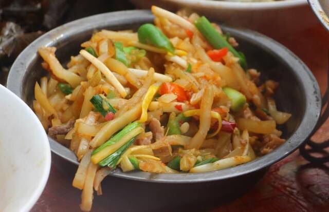 三、然后锅里再适量放油,生姜蒜子,干辣椒,豆瓣酱炒香,再把榨菜青红椒丝倒进 去炒,翻两下把肉丝倒进去,然后调味胡椒,鸡精,生抽,放点葱段或大蒜,再翻两下就可以了,起锅之前也可以适量放点红油。 条件好可以淋点高汤什么的。