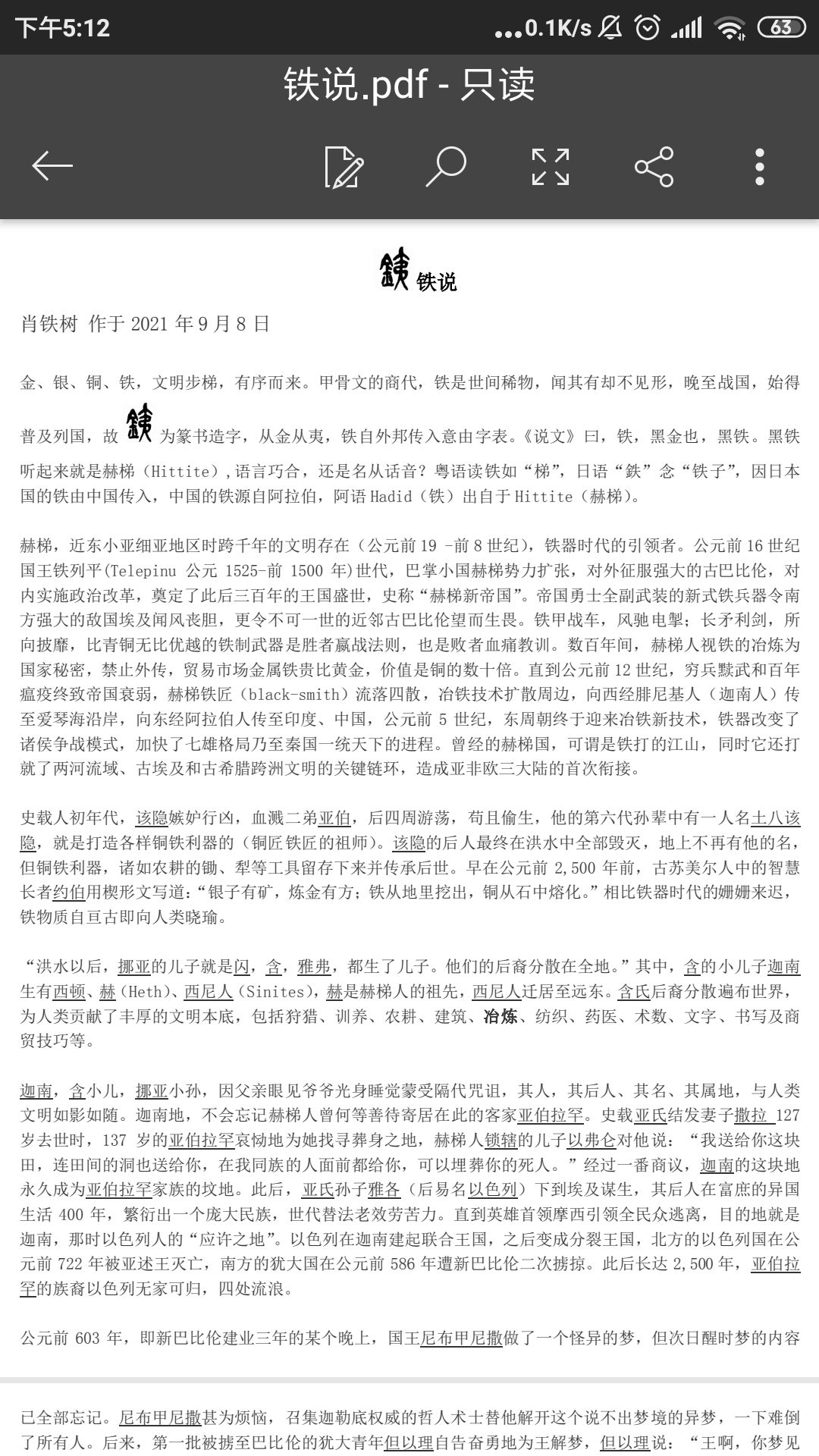 金、银、铜、铁,文明步梯,有序而来。甲骨文的商代,铁是世间稀物,闻其有却不见形,晚至战国,始得普及列国,故为篆书造字,从金从夷,铁自外邦传入意由字表。《说文》曰,铁,黑金也,黑铁。黑铁听起来就是赫梯(Hittite),语言巧合,还是名从话音?粤语读铁如“梯”,日语“鉄”念“铁子”,因日本国的铁由中国传入,中国的铁源自阿拉伯,阿语Hadid(铁)出自于Hittite(赫梯)。