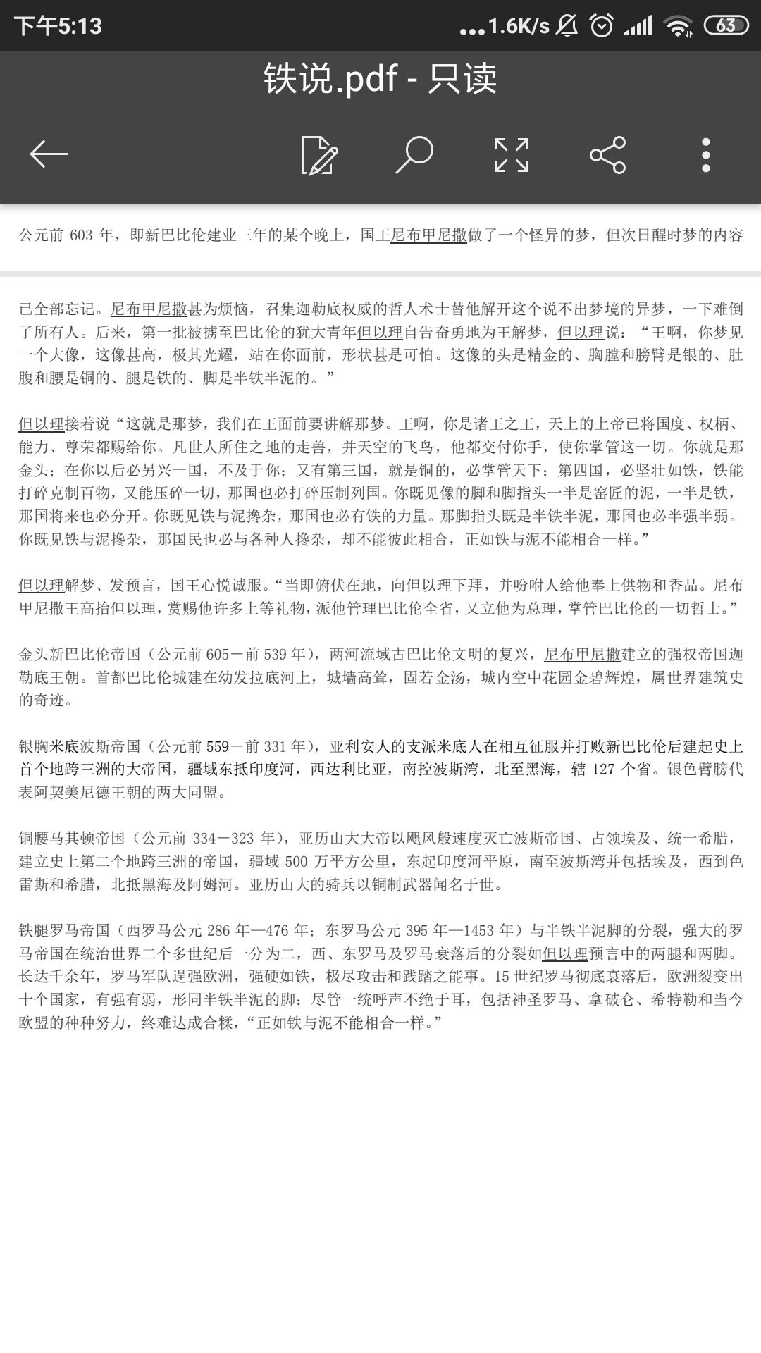 但以理接着说“这就是那梦,我们在王面前要讲解那梦。王啊,你是诸王之王,天上的上帝已将国度、权柄、能力、尊荣都赐给你。凡世人所住之地的走兽,并天空的飞鸟,他都交付你手,使你掌管这一切。你就是那金头;在你以后必另兴一国,不及于你;又有第三国,就是铜的,必掌管天下;第四国,必坚壮如铁,铁能打碎克制百物,又能压碎一切,那国也必打碎压制列国。你既见像的脚和脚指头一半是窑匠的泥,一半是铁,那国将来也必分开。你既见铁与泥搀杂,那国也必有铁的力量。那脚指头既是半铁半泥,那国也必半强半弱。你既见铁与泥搀杂,那国民也必与各种人搀杂,却不能彼此相合,正如铁与泥不能相合一样。”