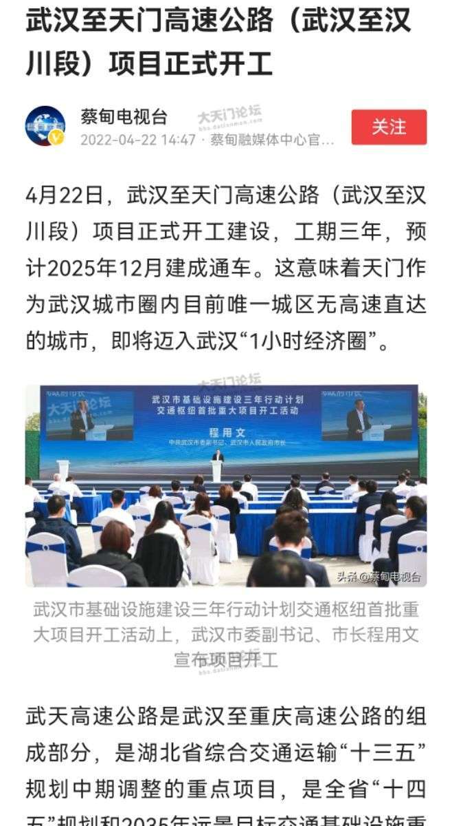 武天高速项目是武汉至重庆高速公路的一部分,该项目起于武汉圈环线高速,东接武天高速武汉至汉川段,止于随岳高速公路,西接拟建的武天宜高速天门至荆门段,线路全长37.705公里。