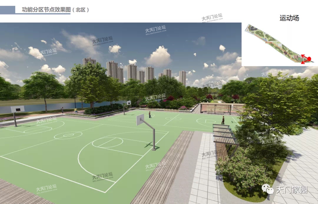 在北区设置运动场地,包括篮球场、羽毛球场、滑板场等,将运动场地和绿色环境进行融合,让市民能够在生态绿色中享受运动的乐趣。同时,在运动场地周边还融入了咖啡书吧和观景阳台一系列休憩停留空间。
