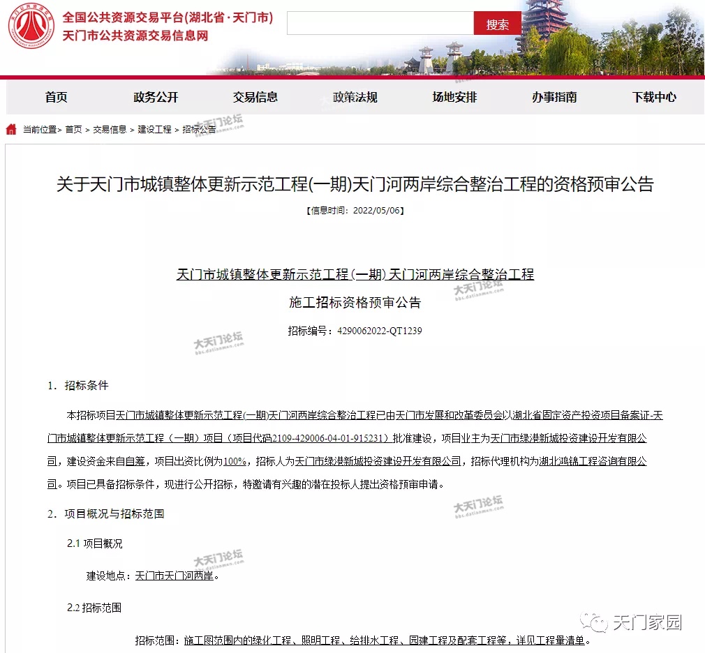 近日,天门市公共资源交易信息网发布天门市城镇整体更新示范工程(一期)天门河两岸综合整治工程项目招标,标志着天门河滨河公园,真的要开工啦!
