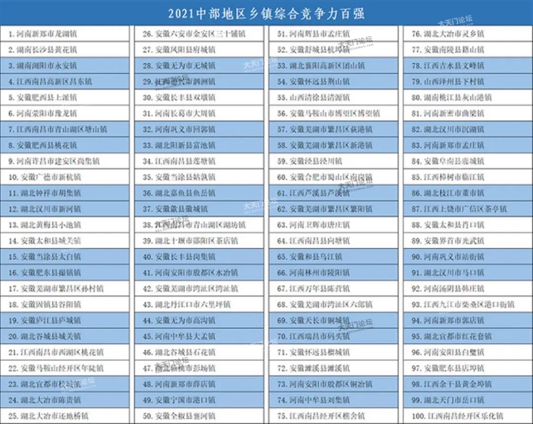 根据同时揭晓的2021中部地区乡镇综合竞争力百强名单,2021中部百强镇数量安徽最多, 为39个,其次分别为湖北20个、河南19个、江西17个、湖南3个、山西2个。