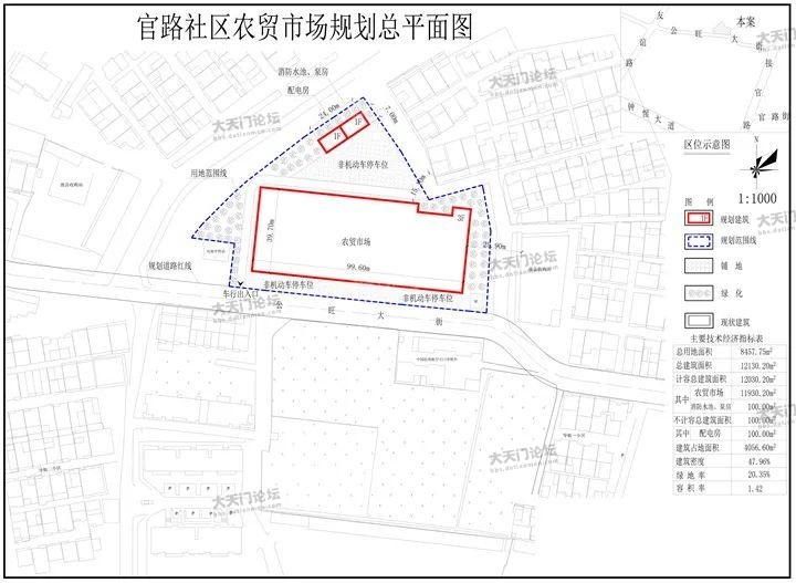 天门市竟陵街道官路社区居民委员会申报的官路社区农贸市场项目,位于接官路以西,公旺大街北侧。规划拟新建3栋建筑及相关配套设施,其中1栋3层农贸市场,1栋1层配电房,1栋1层消防泵房。项目总建筑面积为12130.20平方米,容积率为1.42,具体详见规划总平面图和效果图。经天门市自然资源和规划局审查,拟同意批准该项目规划方案,现将拟批准的规划总平面图予以公示。有关单位或个人如对此规划有异议,请在公示期间向天门市自然资源和规划局提出书面异议书