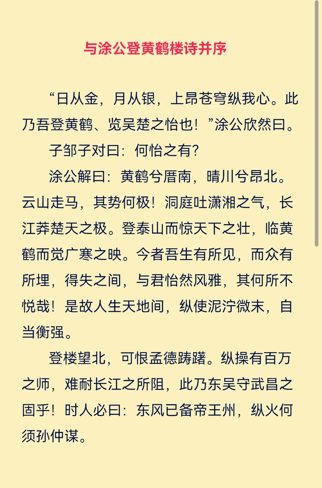 涂公解曰:黄鹤兮厝南,晴川兮昂北。云山走马,其势何极!洞庭吐潇湘之气,长江莽楚天之极。登泰山而惊天下之壮,临黄鹤而觉广寒之映。今者吾生有所见,而众有所埋,得失之间,与君怡然风雅,其何所不悦哉!是故人生天地间,纵使泥泞微末,自当衡强。