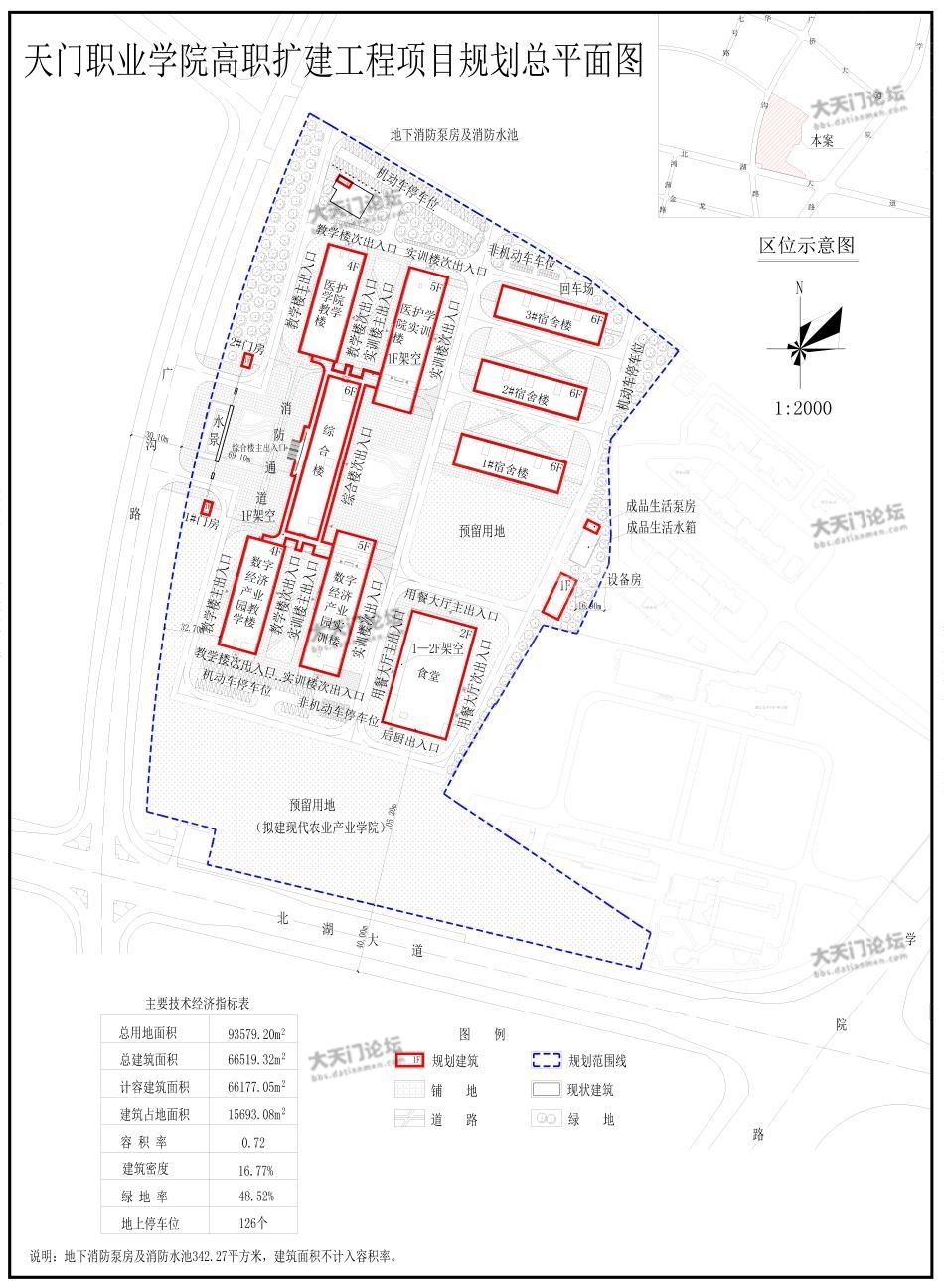 天门职业学院申报的天门职业学院高职扩建工程项目,位于北湖大道与广沟路交会处。规划拟新建5栋建筑及相关配套设施,其中1栋6层综合楼及附属教学楼,1栋2层食堂,3栋6层宿舍楼。项目总建筑面积为66519.32平方米,计容总建筑面积为66177.05平方米,容积率为0.72,日照分析满足规范要求,具体详见规划总平面图、日照分析图和效果图。经我局审查,拟同意批准该项目规划方案,现将拟批准的规划总平面图予以公示。有关单位或个人如对此规划有异议,请在公示期间向市自然资源和规划局提出书面异议书。