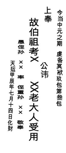 接下来就是写袱包了。自从我十岁那年祖父教会我写袱包后,家里的袱包一直都是我写,直到离开家到武汉上大学。对不甚老练的人来说,写袱包必不可少的辅助工具是袱钱本子。袱钱本子上记载了本家五服以内去世的亲人的名讳,包括高祖、曾祖、叔(伯)曾祖、显祖、叔(伯)祖、显考、叔(伯)考等,以及他们妻子的姓氏。这些人都是需要供奉的,否则,不仅死去的人不高兴,他们在世间的后人也会有意见。写袱包的格式是由右至左、由上到下,一共五行。第一行:孝孙(或子、或侄、或重孙,根据与供奉的对象的关系而定)XXX虔备袱钱;第二行:奉上XXX元(根据亲疏关系而定,亲的多、疏的少);第三行字体要大:显祖X(姓)公讳(这个“讳”字要偏右写小一点)XX(名)老大人妣X(妻子的姓)老孺人;第四行靠下:其中受用;第五行居中:中元日化(或即日化,根据准备焚烧纸钱的日子而定)。正面写完后,还要在反面画一个大大的“封”字,之所以说是画,不说写,是因为这个“封”字在这里是一个符,它的作用就像密码锁,封住之后,这个袱包就只有指定的供奉对象能打开了。再写完给去世的亲人的袱包后,还要给车夫写一个,就是雇车帮亲人们把袱包运回阴曹地府的车马费。