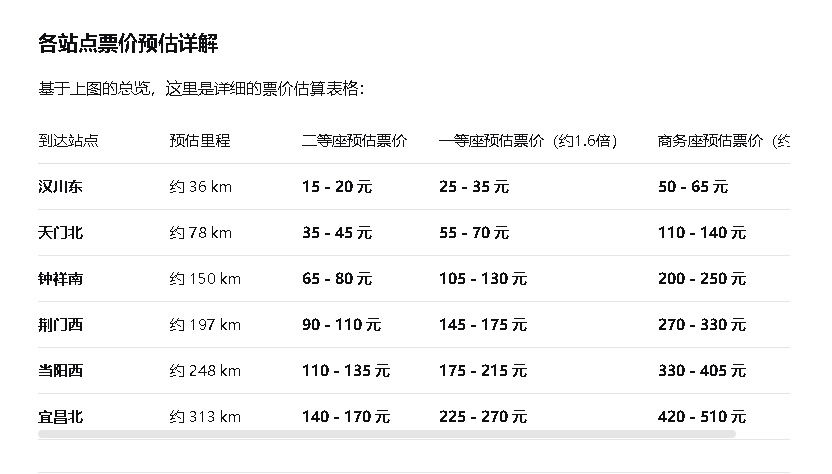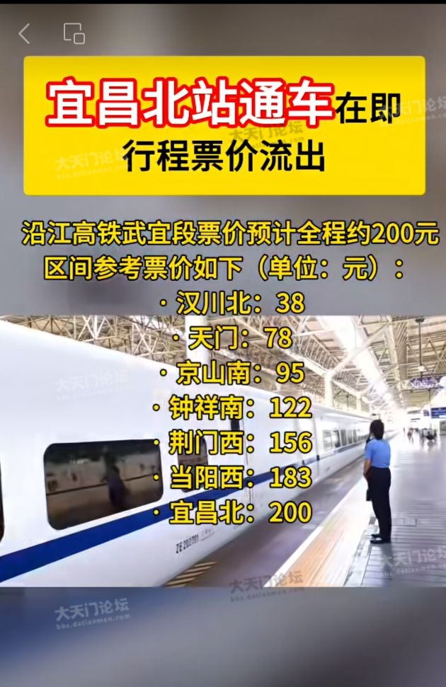 :你的回复一看就不对,这里有两个错误,一是天门站到汉口站有110多公里,而不是你说的80公里,怎么可能比天门南距离还短。二是现在新开通高铁普遍涨价,咸宁的高铁是全国第一条高铁,现在成本造价都涨了好多,还按照以前的标准,怎么可能。现在新开通高铁普遍每公里7至8毛