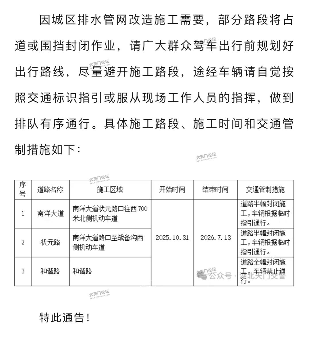 天门这几条路因水网改造可能封闭到明年7月