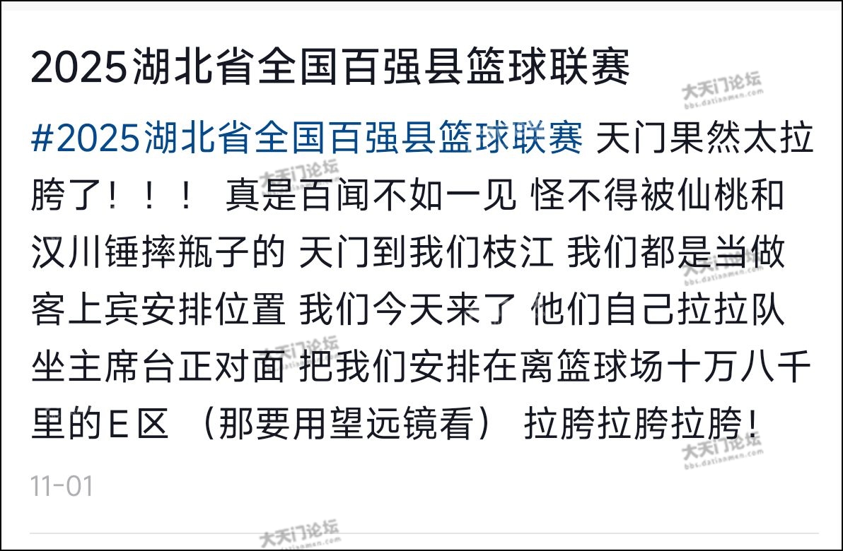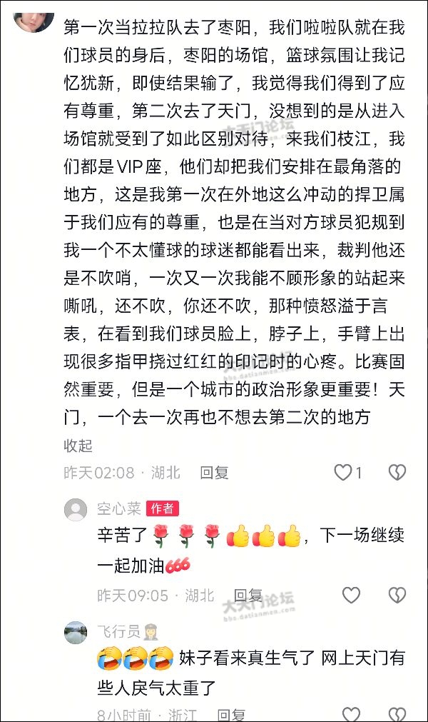 :没有争论比赛成绩,他们在吐槽天门待客之道,这只能怪体育馆领导不作为,欠考虑,应该安排好座位,天门是东道主