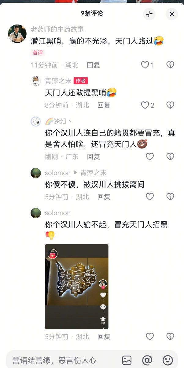 :路与他人各不同,不必听风就动容 黑天门的视频和文章最有流量,为什么呢?因为我们会有大把的天门人会去反驳,反驳评论的多了就有流量了,他们就会越有动力去干,你去反驳后难道他以后就不发了,不,不,不,他下次会更来劲,外面的一点风吹狗吠声,就乱了自己的步伐,慌了自己内心的宁静,犯不着,所有天门老乡记住了,碰到那些长期抹黑天门,踩天门,地域黑天门的号默默去举报才是最明智有效的办法,不仅举报这个评论,还去举报这个人,上传强有力的证据上,举报的多了,系统会特别关注他,后面封他号,号封多了,这类人在网上就消失了,去他下面争论永无止静的,起不到半分作用,他下次还会一样发,网络上的语言暴力,地域黑,对立引战扭曲事实,相关部门真应该立法严惩严管了