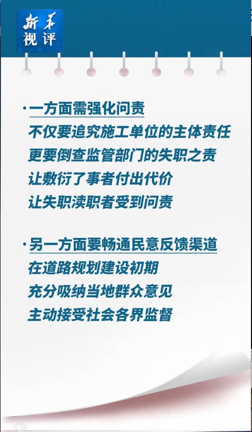 一方面需强化问责,不仅要追究施工单位的主体责任,更要倒查监管部门的失职之责,让敷衍了事者付出代价,让失职渎职者受到问责;另一方面要畅通民意反馈渠道,在道路规划建设初期,充分吸纳当地群众意见,主动接受社会各界监督。把民生工程当成“良心活”来干,让民生工程真正暖到群众心坎上。