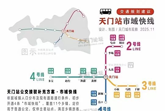 在之前公布的《天门站公交接驳运输方案》(征求意见稿)乡镇公交专线换乘城区公交的基础上,依据城镇人口分布及现有道路通行条件,初步开通4条“市域快线”直达沿江高铁天门站,覆盖11个乡镇,定价高于普通公交,仅停主要站点,满足乡镇旅客一站式快速、便捷的高铁站接驳需求。