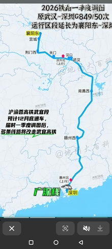 襄阳东至深圳的高铁,经襄荆、沪渝蓉、武九、京港、赣深运行,两点观察: