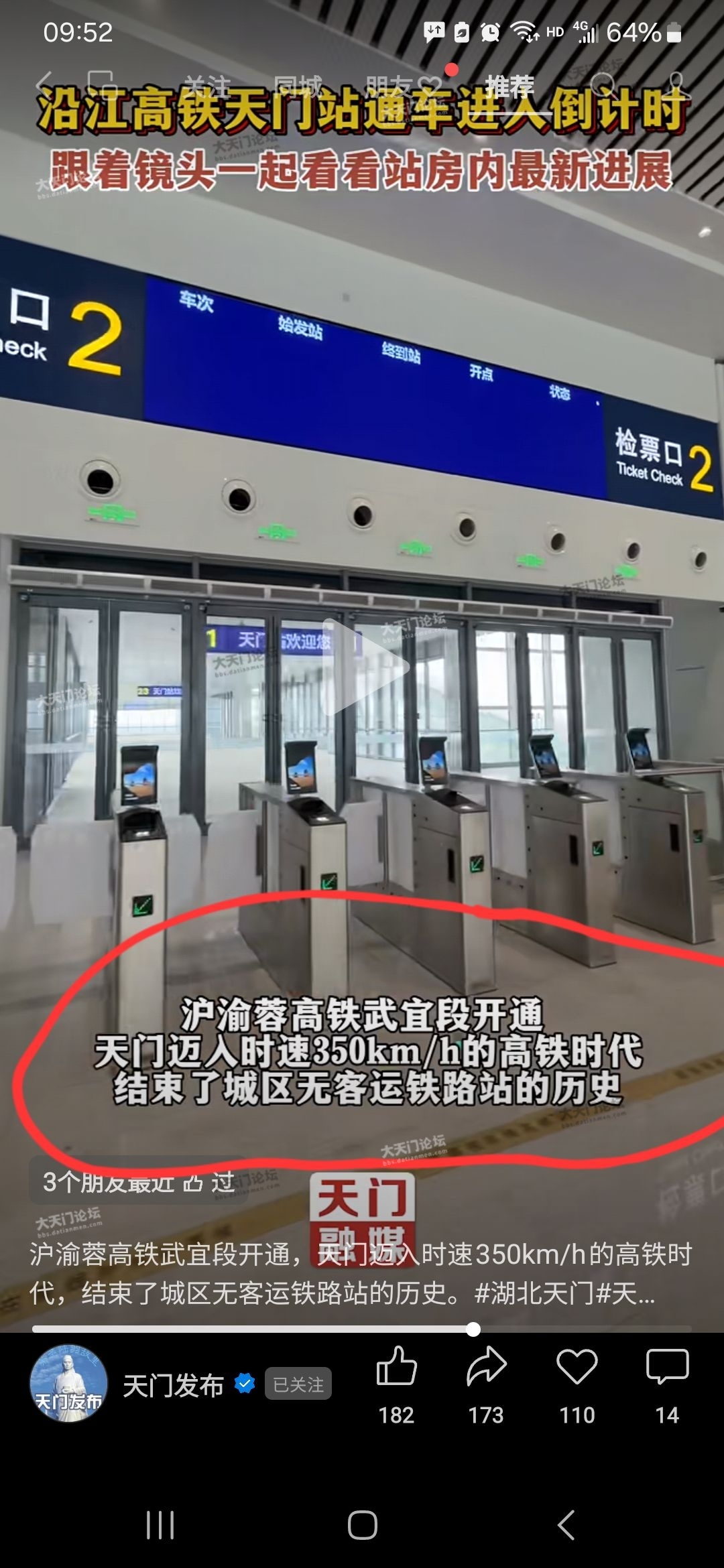 一、沪渝蓉高铁武宜段开通,天门迈入时速350的高铁时代,结束了城区无客运铁路站的历史。