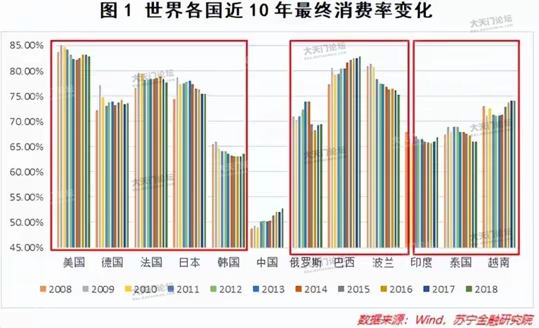 可能很多人觉得这个水平是比发达国家低,其实不然,因为中国的该数据不光是明显低于美国的81.3%、日本的75.4%、韩国的67.8%,甚至相比印度的70.7%、泰国的74.3%、越南的63.4%、巴西的81.6%等发展中国家,也有明显的差距。