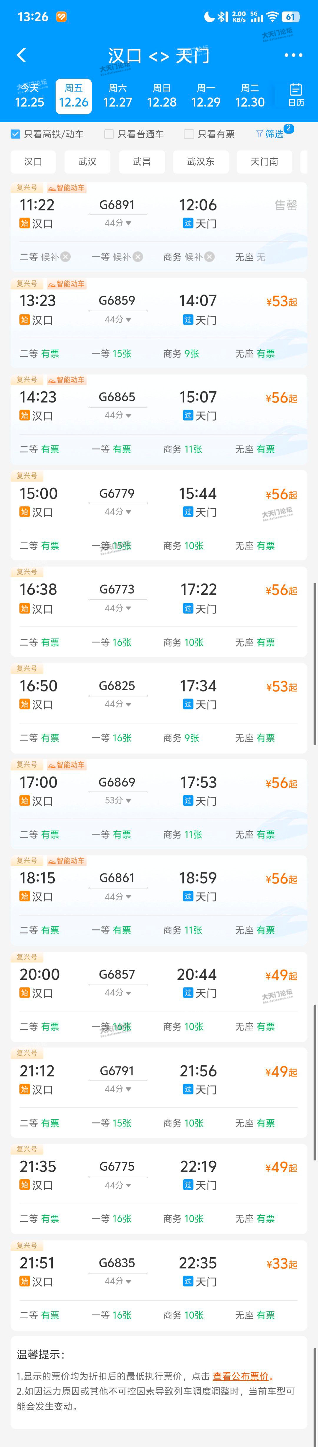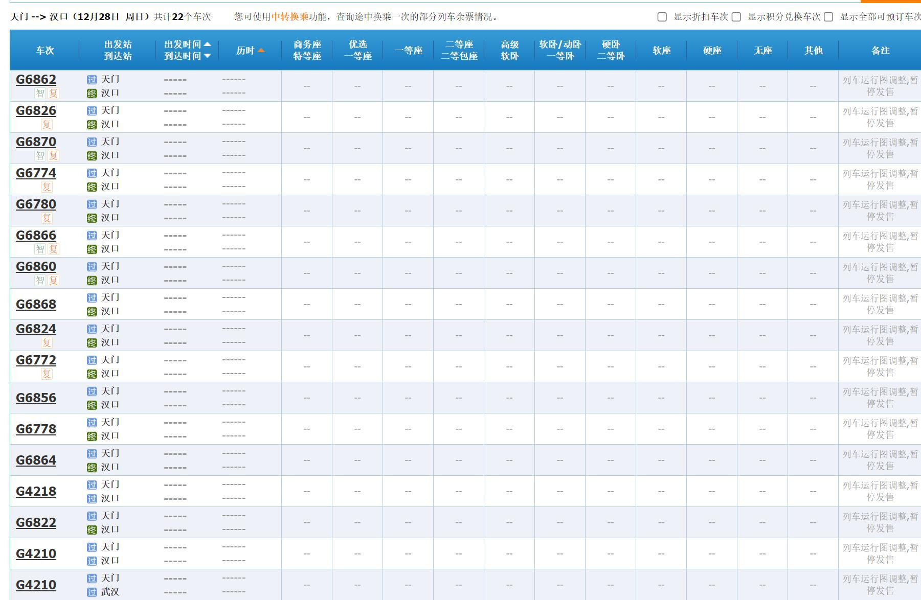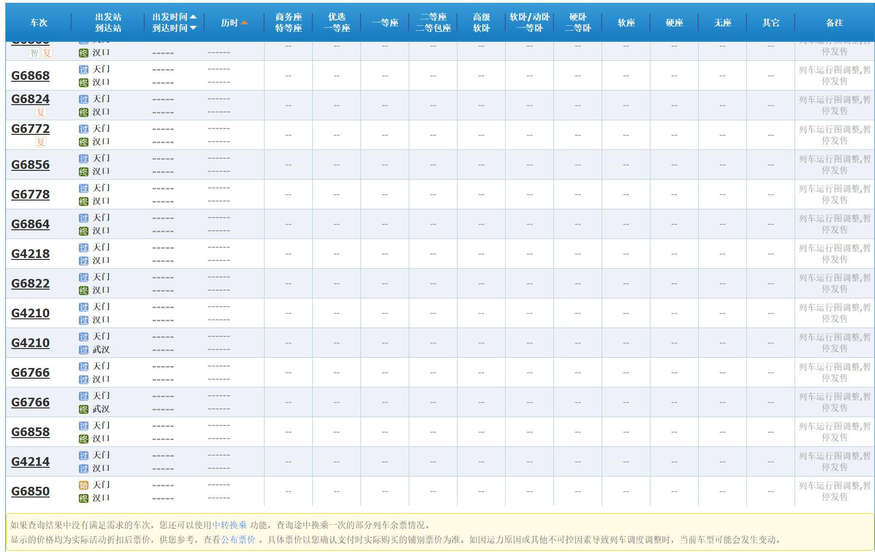 沪渝蓉高铁武宜段汉口站——天门站车次时刻【12趟】