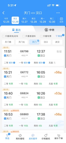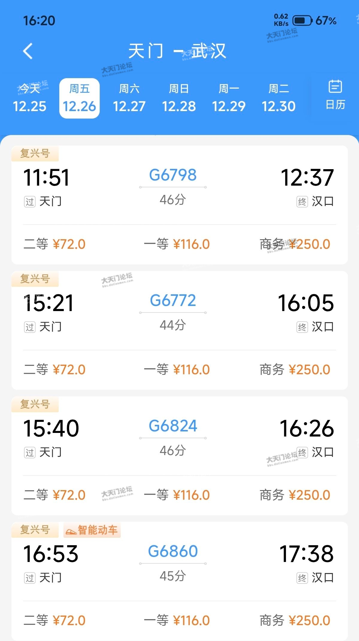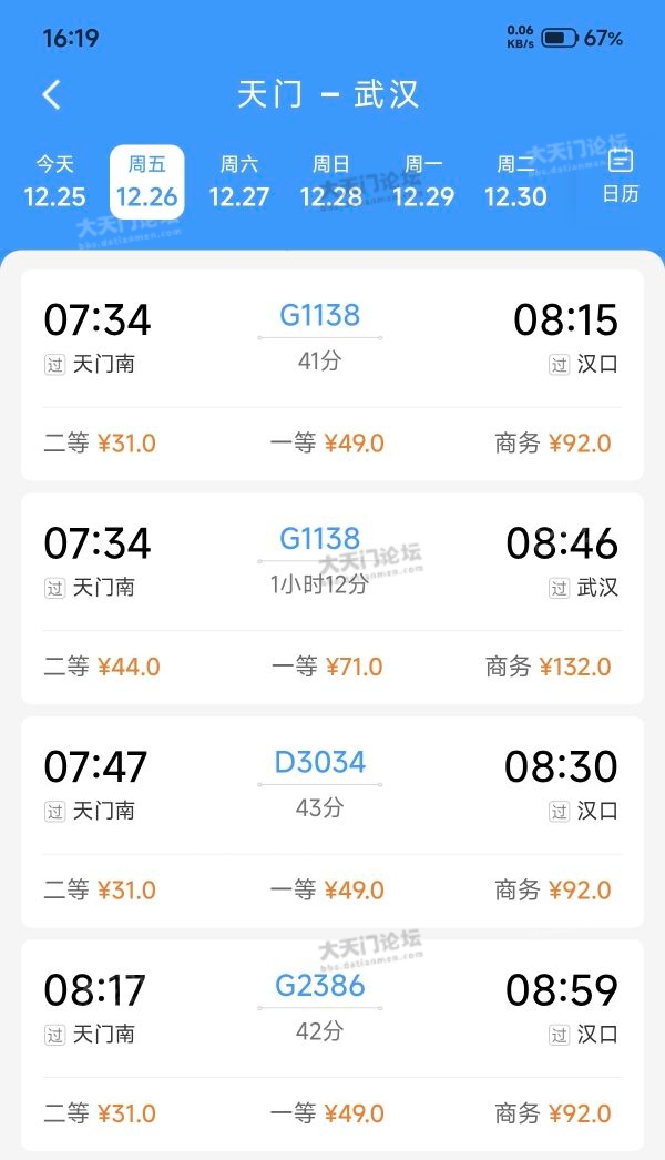 天门站票价高点,而都是晚上跑的。还是天门南的车次时间价格亲民。