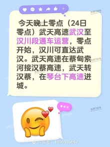 今天晚上零点(24日零点)武天高速武汉至汉川段通车运营,零点开始,天门可直达武汉。武天高速在蔡甸索河接汉蔡高速,武天转汉蔡,在琴台下高速进城。