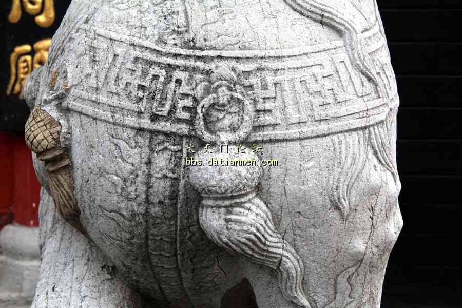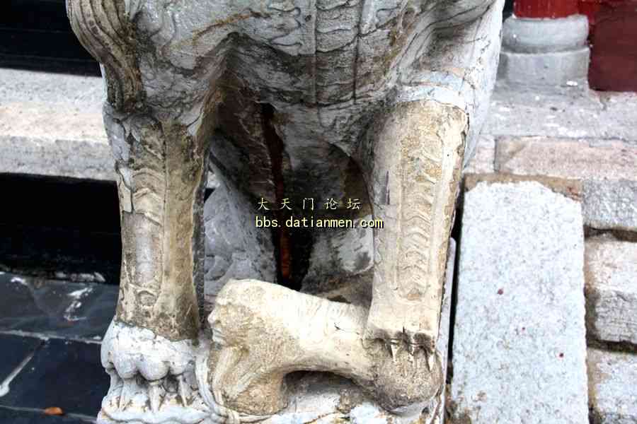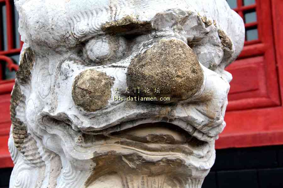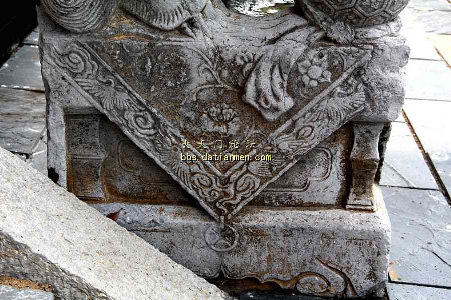 从这对石狮子造型看来,具有明清时期的石雕特点:造型优美,神态威严,线条流畅,图案精细,头大身长,嘴阔爪利,目瞪发卷。颈围万福带,脖挂缨花铃;须弥座上祥云、仙鹤;绣花球中牡丹、芳草。根据这些特点,我个人认为明代的可能性大一些,距离今天应该有4——5百年了。如保留完好则是一件不可多得的石雕精品,可惜残缺严重,修复粗糙。而且破损严重。记得小时候摸过,感觉是光滑的,而现在摸起来却很粗糙。说明这件文物受到人为破坏,风雨侵蚀,频繁搬运,修复粗劣,保护不力。