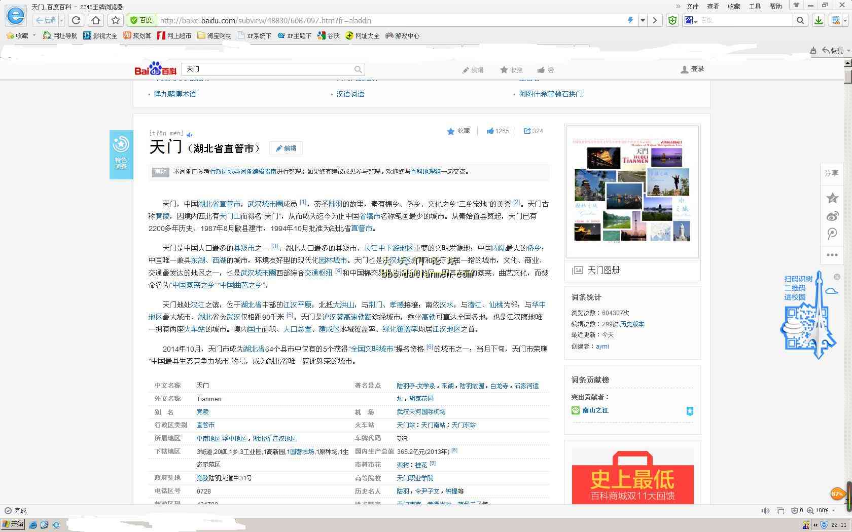 http://a.hiphotos.baidu.com/baike/c0%3Dbaike92%2C5%2C5%2C92%2C30%3Bt%3Dgif/sign=822ec3134990f60310bd9415587bd87e/2e2eb9389b504fc2ddceff27e6dde71190ef6d7a.jpg同为直管市,怎么编写成这样?差距大,就概述图而言,天门明显有差距,请有权限的百度百科网友重新编辑天门,在天门图片编辑上要大气一点,至少不能输给潜江、仙桃。天门漂亮的图片很多。