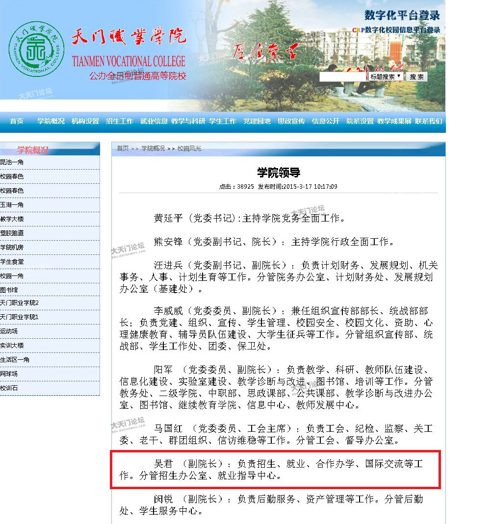 2019年07月11日据天门市纪委监委消息:天门职业学院副院长吴君涉嫌严重违纪和职务违法,目前正在接受天门市纪委监委纪律审查和监察调查。(天门市纪委监委)